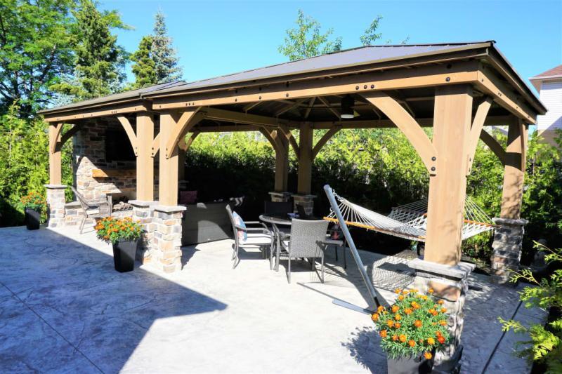The wood gazebo with aluminum roof adds character to any area creating the perfect setting for all your outdoor entertainment needs.